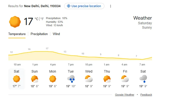 मौसम विभाग के अनुसार, आज दिल्ली में आकाश में बादल रहेंगे। सुबह के समय हल्का या मध्यम कोहरा भी रह सकता है। हवा की रफ्तार 10 से 20 किमी प्रति घंटे के बीच हो सकती है। दिल्ली में आज का अधिकतम तापमान 17°C और न्यूनतम 7°C रहने की संभावना है। शनिवार को दिल्ली में बारिश नहीं होगी।