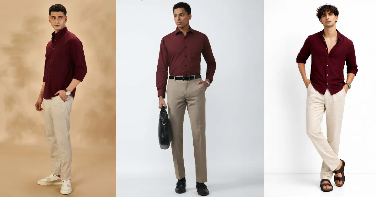 मैरून शर्ट और बेज पैंट का मेल रिच और सॉफ्ट कॉन्ट्रास्ट देता है। यह कॉम्बिनेशन फेस्टिव या सेमी-फॉर्मल मौके पर शानदार लगता है।