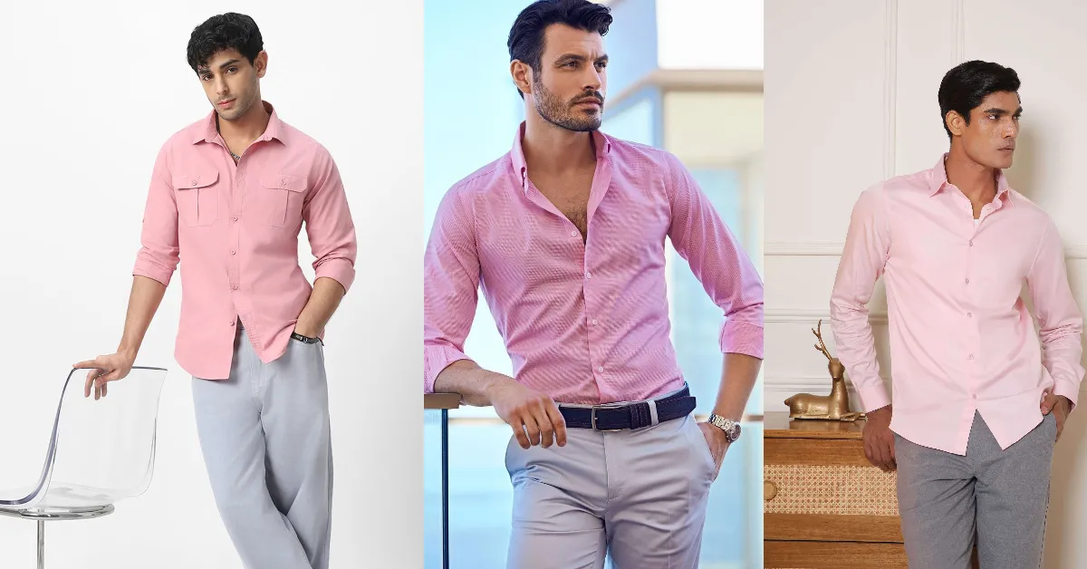 लाइट पिंक शर्ट के साथ ग्रे पैंट के साथ फ्रेश और मॉडर्न वाइब देता है, ऑफिस या डे-टाइम इवेंट के लिए यह बढ़िया विकल्प है।
