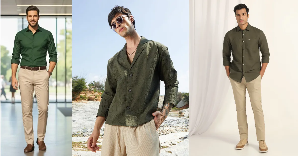 ग्रीन शर्ट और बेज पैंट का कॉम्बिनेशन नेचुरल और क्लीन लुक देता है। यह आउटफिट कैजुअल डे आउट या फ्रेंड्स गेट-टुगेदर के लिए सही रहता है।