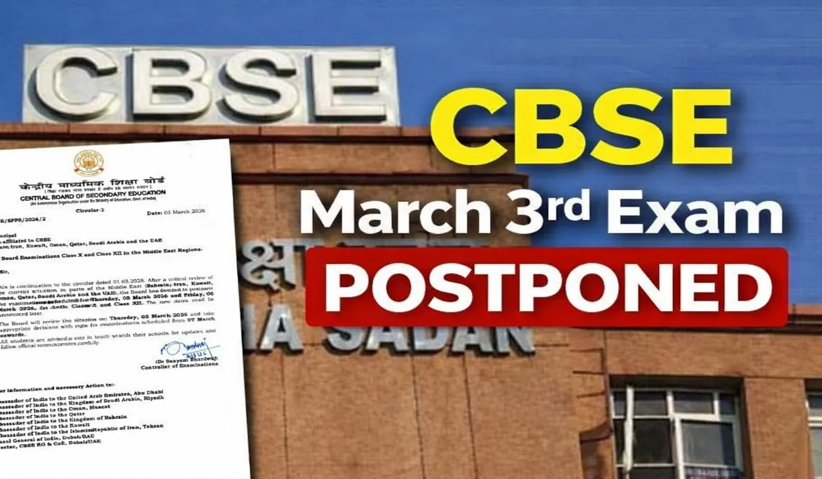 CBSE March 3rd Exam Postponed: केंद्रीय माध्यमिक शिक्षा बोर्ड यानी सीबीएसई ने मध्य पूर्व एशिया के विभिन्न देशों में आयोजित होने वाली कक्षा 10 और कक्षा 12 की बोर्ड परीक्षाओं को लेकर एक और सर्कुलर जारी किया है। बोर्ड ने ईरान-इजरायल युद्ध के मद्देनजर फिलहाल यहां अगली दो और बोर्ड परीक्षाएं स्थगित करने का फैसला किया है। यह निर्णय बहरीन, ईरान, कुवैत, ओमान, कतर, सऊदी अरब और संयुक्त अरब अमीरात में स्थित संबद्ध विद्यालयों के लिए लागू होगा।