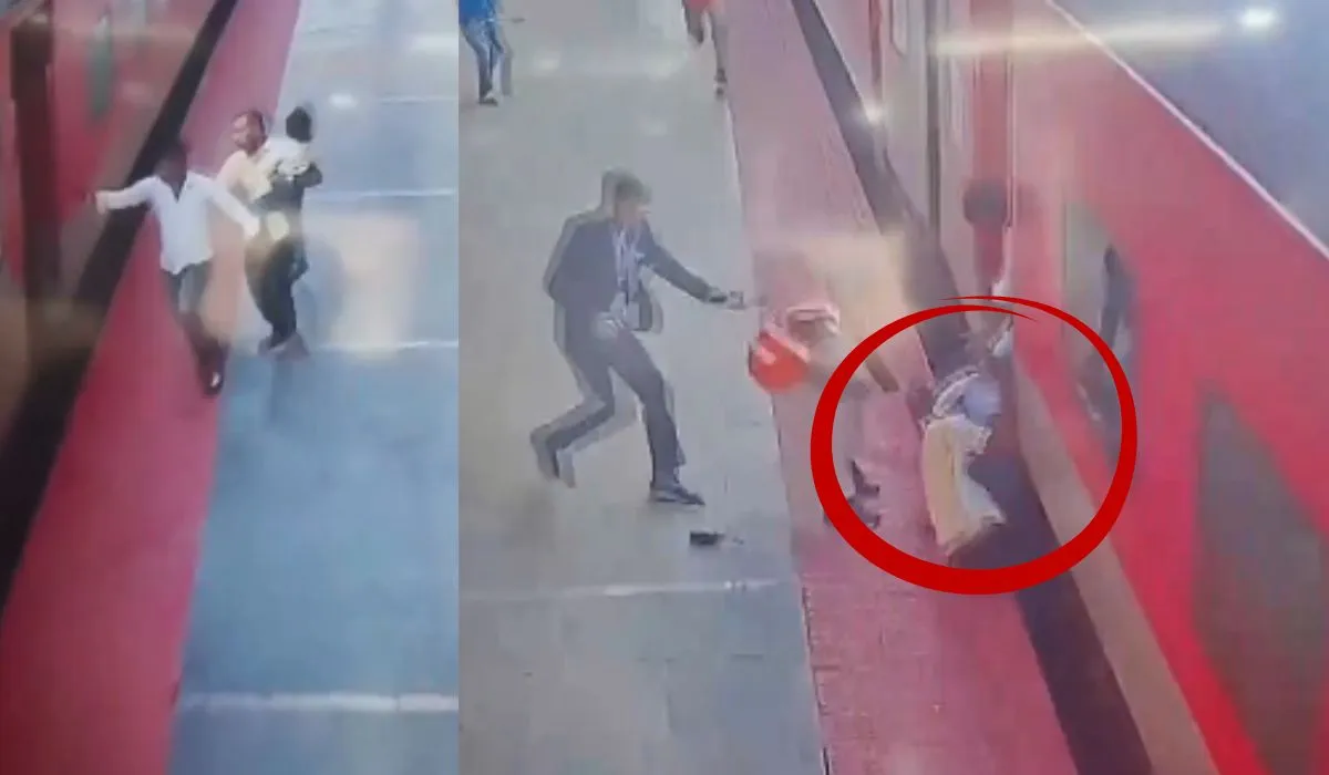 Prayagraj Station Viral Video: प्रयागराज रेलवे स्टेशन पर रविवार को एक बड़ा हादसा टल गया। जहां एक यात्री अपनी छोटी बच्ची को गोद में लेकर चलती हुई काशी एक्सप्रेस (गाड़ी संख्या 15018) में चढ़ने की कोशिश कर रहा था, तभी अचानक उसका पैर फिसला और वह प्लेटफॉर्म और ट्रेन के बीच की खाई में गिर पड़ा। थोड़ी दूर तक वह बच्ची के साथ घिसटते हुए चलता रहा। ये देख प्लेटफार्म पर अफरा-तफरी मच गई। लेकिन रेलवे सुरक्षा बल (RPF) के जवानों के तुरंत एक्शन और साहस से दोनों की जान बचाई गई।